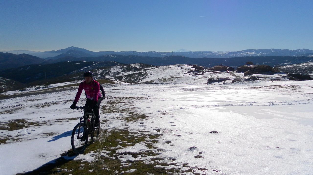 Este tramo de pista se hace eterno, lo que debía ser una zona rápida se convierte en una pelea constante con la nieve, dejándonos las fuerzas ya muy tocadas, y la moral también. Tras ir poco a poco disminuyendo la nieve en la pista, salimos a una zona ya con rodadas donde por fín podemos avanzar a buen ritmo. Lo peor de todo ha sido ver que casi no había nieve en los alrededores y sin embargo la pista estaba blanca. Fijaros en esta foto donde no se más nieve que la de la pista.